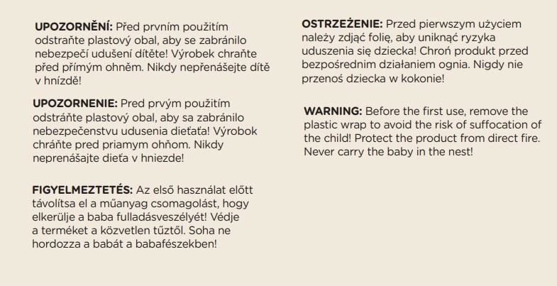 - Verwijder de plastic verpakking vóór gebruik; beschermen tegen vuur; draag een kind nooit in het nestje