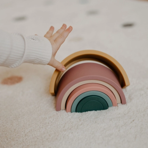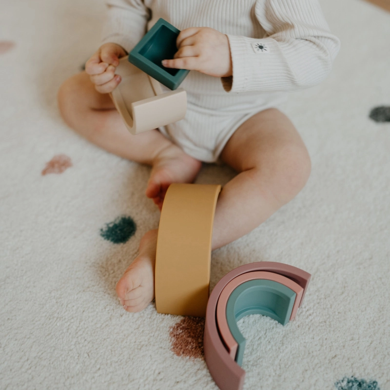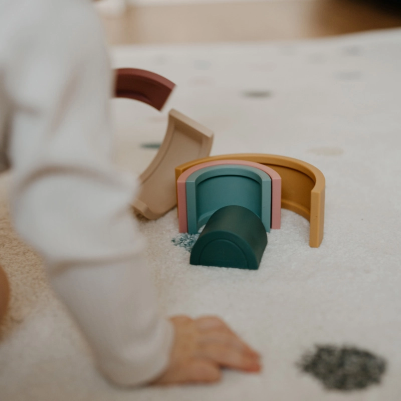 De siliconen stapelregenboog Misty Green biedt kinderen open spel zonder regels. De bogen kunnen gestapeld, gedraaid en gebalanceerd worden of gebruikt als eenvoudige bruggen en tunnels. Zo trainen kinderen spelenderwijs hun ruimtelijk inzicht, concentratie en precisie van bewegingen – terwijl ze veel plezier hebben.