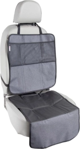 Het product kan worden opgesplitst in twee afzonderlijke delen – het onderste deel bedekt de zitting en voorrand van de stoel onder het autostoeltje, terwijl het bovenste deel dient als kickbeschermer met opbergvakken. Installatie is in een handomdraai dankzij de verstelbare riemen en de universele bevestiging aan de hoofdsteun.