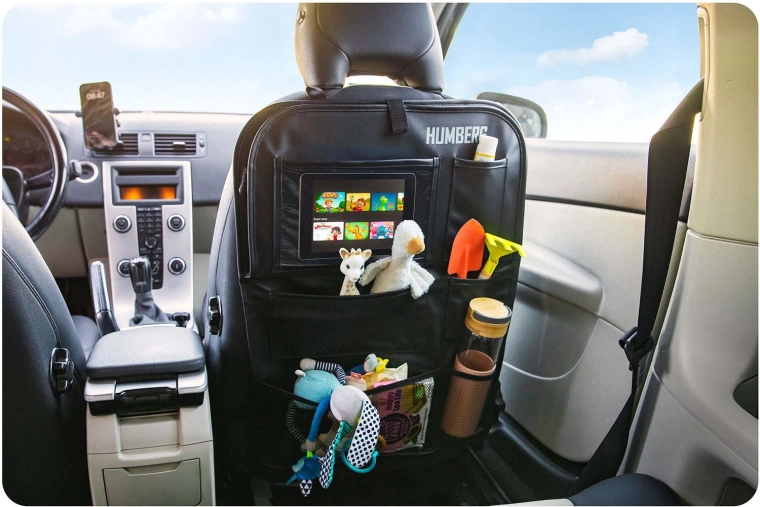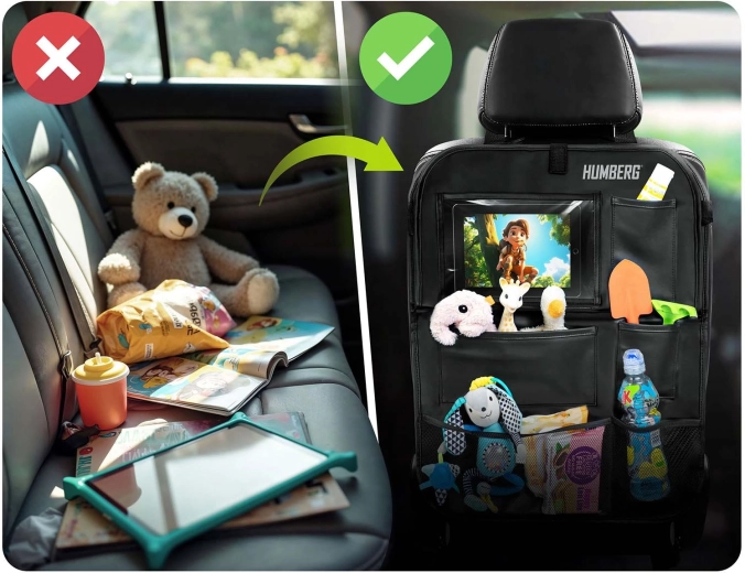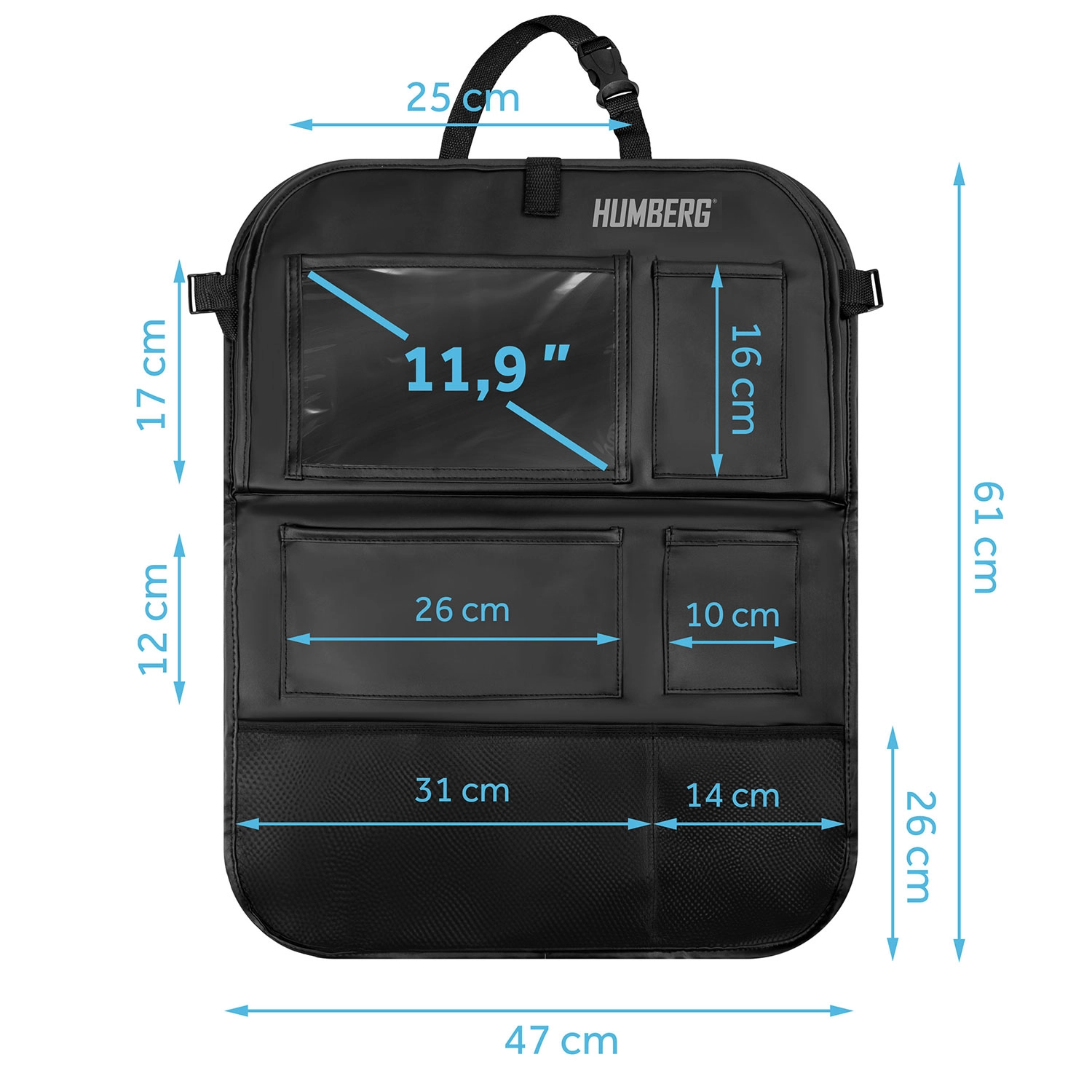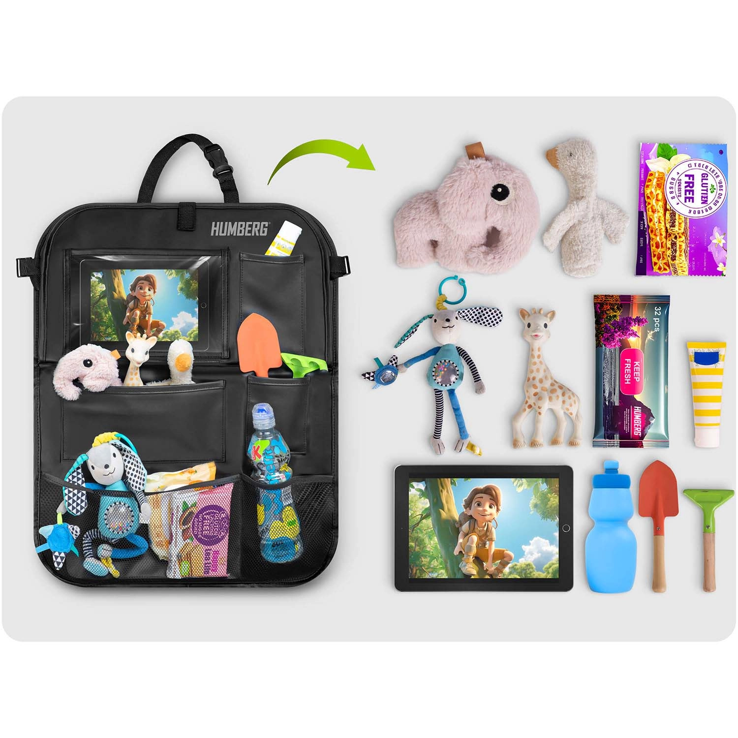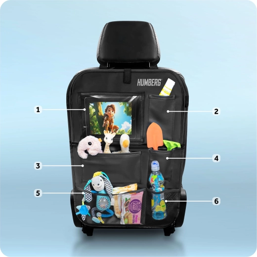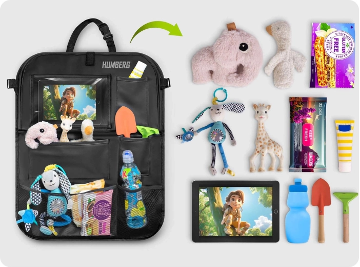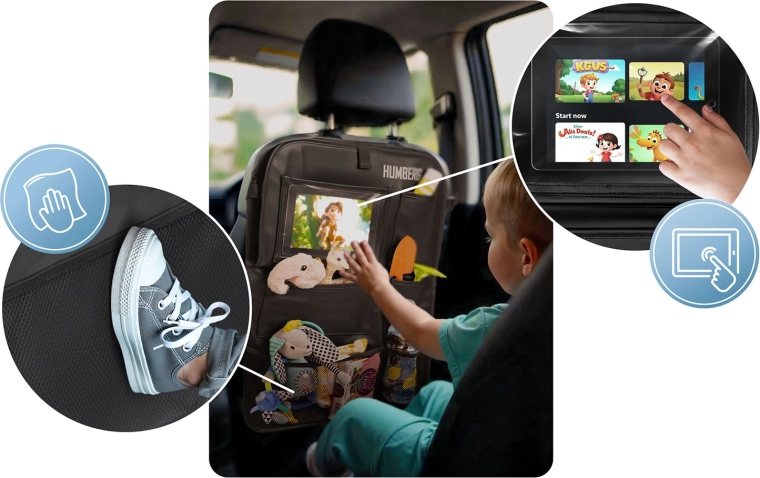 Houd de auto overzichtelijk en reizen met kinderen rustiger dankzij de praktische HUMBERG-organizer voor de achterkant van de stoel. Biedt een transparant tabletvak met touchscreenfolie, een neerklapbaar tafeltje voor snacks of tekenen, een fleshouder en meerdere ruime vakken voor speelgoed en kleine spulletjes. Eenvoudige montage, makkelijk te reinigen materiaal en bescherming van de bekleding tegen vuil van schoenen.