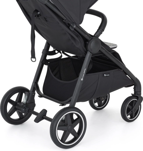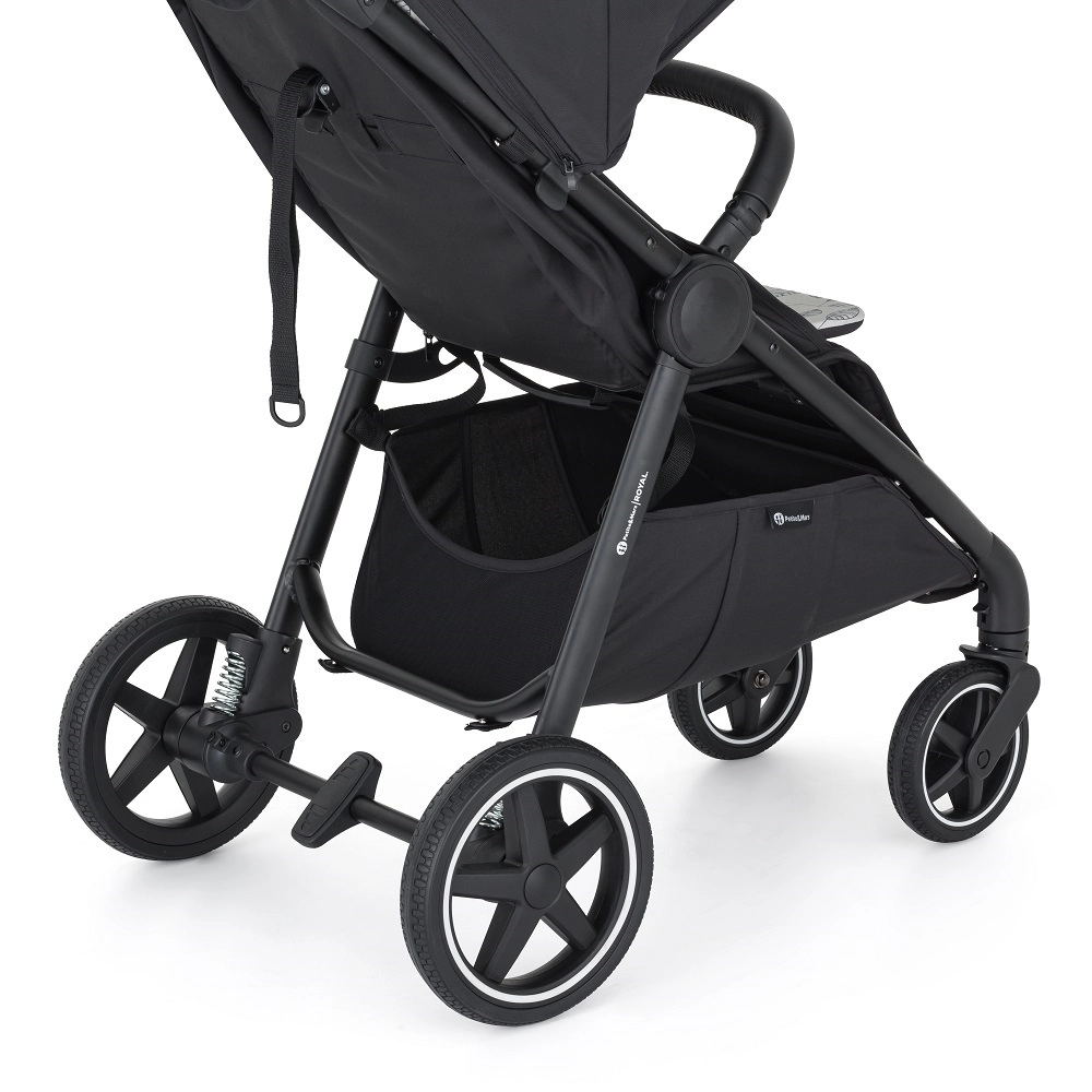 Volrubberen wielen met een stijlvolle witte bies en vering zorgen voor een stabiele rit, ook op oneffenheden, en zijn ongevoelig voor lekrijden. Het stevige aluminium frame, de centrale rem en de kwalitatieve wielbevestigingen garanderen veiligheid, terwijl de grote boodschappenmand en de verzorgingstas dagelijkse uitstapjes vergemakkelijken. De buggy groeit met het gezin mee – de kap kan eenvoudig worden vervangen door een andere kleur (compatibel met Royal2/Royal3).