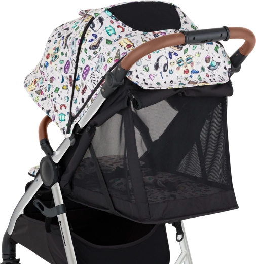 frame, voor- en achterwielen van volrubber, zitbekleding, luiertas, zwarte beenkap, kap, inleg in Tattoo-patroon, 3-delige bekleding