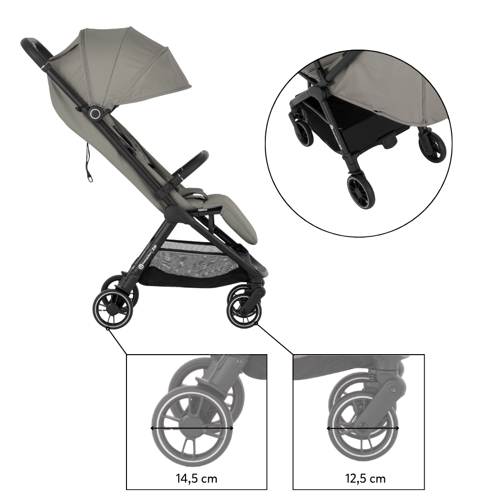 In de stad en in het park waardeer je de geveerde EVA-wielen (voor 5,5", achter 6,5") voor een soepele rit en de praktische kabelrem die buiten je loopbereik is geplaatst. De bagagemand van 5 kg biedt ruimte voor boodschappen en benodigdheden. Duurzame materialen zijn makkelijk schoon te maken, zodat de buggy er ook bij dagelijks gebruik geweldig blijft uitzien.