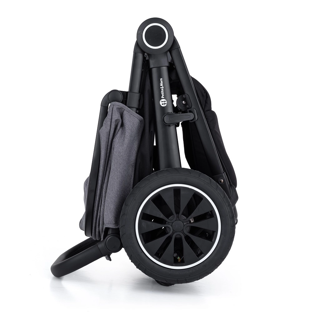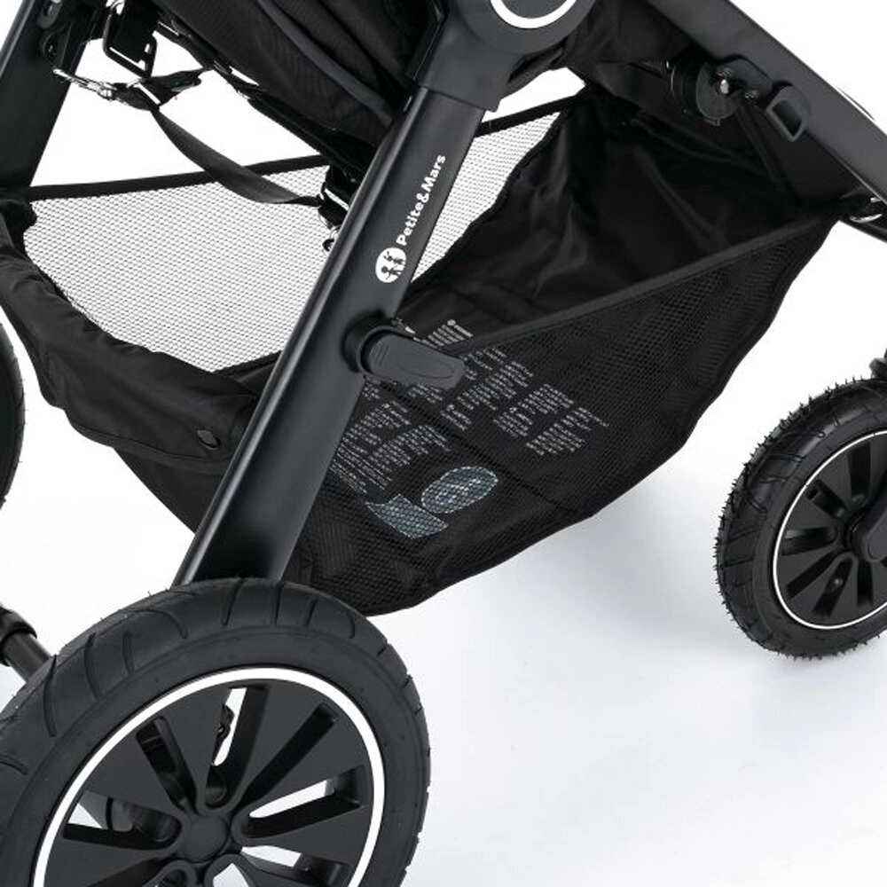 PETITE&MARS Street+ Air Black Limited is een doordachte kinderwagen voor kinderen van 6 maanden tot 22 kg, ontworpen voor het comfort van kind en ouder. Het lichte maar stevige frame absorbeert schokken en de luchtbanden verhogen de stabiliteit en wendbaarheid in de stad en op onverharde paden. De extra grote kap met kijkvenster en SPF 50 beschermt tegen zon en wind, terwijl het lange liggedeelte en de hoge rugleuning overal voor comfort zorgen.