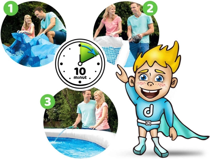 - Eenvoudige installatie – uitrollen, rand opblazen, water vullen.