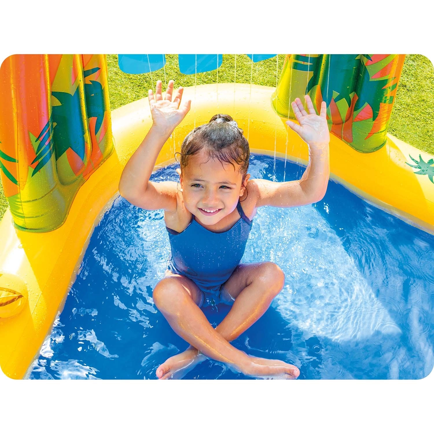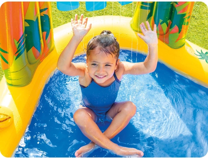 De ingebouwde vernevelaar zorgt voor een fijne waterregen vanuit de palm/het blad. Sluit eenvoudig de tuinslang aan en kinderen genieten van een koele sproeier tijdens het glijden en spelen in het badje.