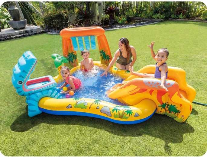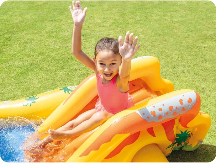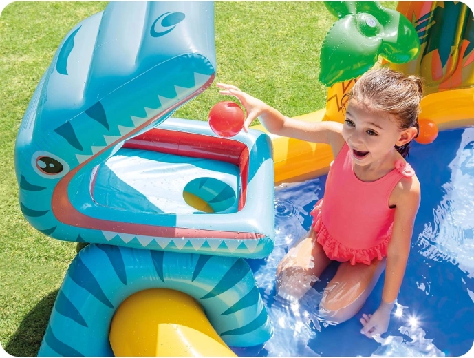 De waterspeelplek met dinothema biedt volop speelmogelijkheden: een ondiep badje om veilig te spetteren, een opblaasbare glijbaan met zachte landing en een watersproeier uit de palm of het blad die voor verfrissing zorgt in de zomerhitte. De grote opblaasbare dinosaurus nodigt bovendien uit tot spel met balletjes – voer hem en oefen je precisie.