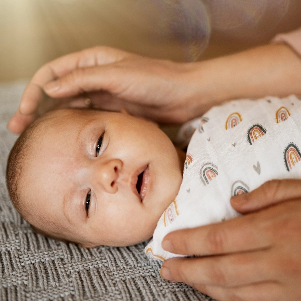 Het formaat 120 × 120 cm maakt veilig en comfortabel inbakeren makkelijk en is veelzijdig in gebruik – van dekentje tot kinderwagenzonwering of een licht dekentje voor het autostoeltje.