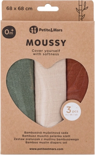 Ontdek de uitzonderlijk zachte en ademende bamboe mousseline doeken PETITE&MARS Moussy in natuurlijke Earth Tones. In een set van 3 stuks en met een afmeting van 68 × 68 cm, ideaal voor toedekken, inwikkelen, afvegen en boertjes laten. Het materiaal met OEKO-TEX Standard 100-certificaat is hypoallergeen, zacht voor de gevoelige huid en heeft thermoregulerende eigenschappen.
