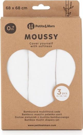 De set PETITE&MARS Moussy Total White biedt drie luchtige mousseline doeken van 70% bamboe en 30% katoen. Dankzij het zachte, luchtige weefsel zijn ze mild voor zelfs de meest gevoelige huid van pasgeborenen en nemen ze uitstekend vocht op. Te gebruiken thuis en onderweg – als handdoekje, knuffeldoek, onderlegger, slabbetje of spuugdoek.