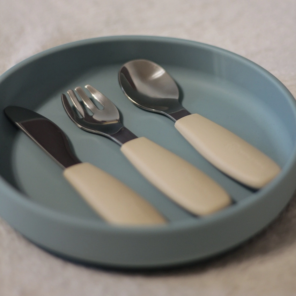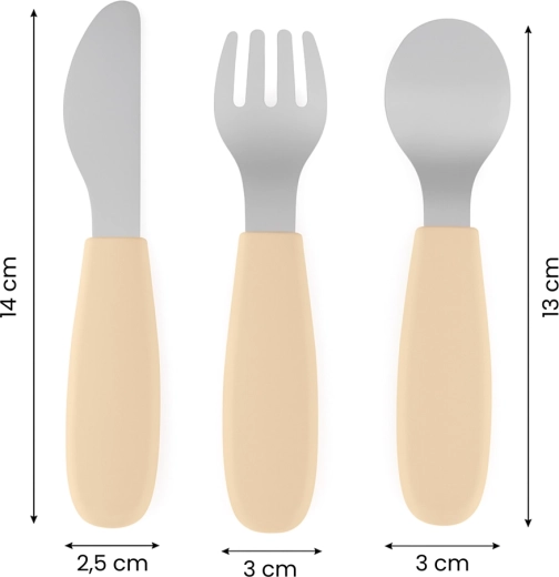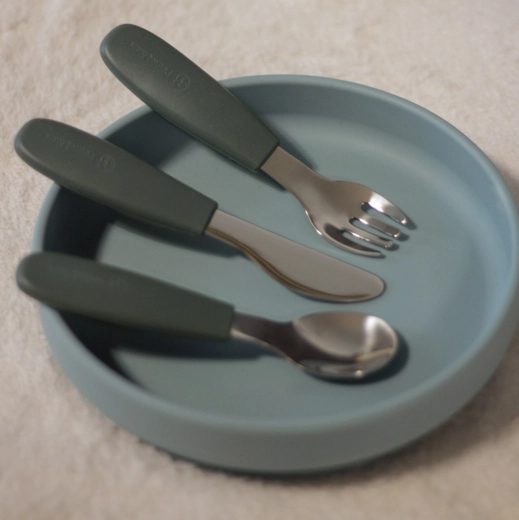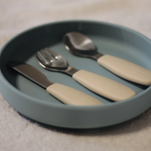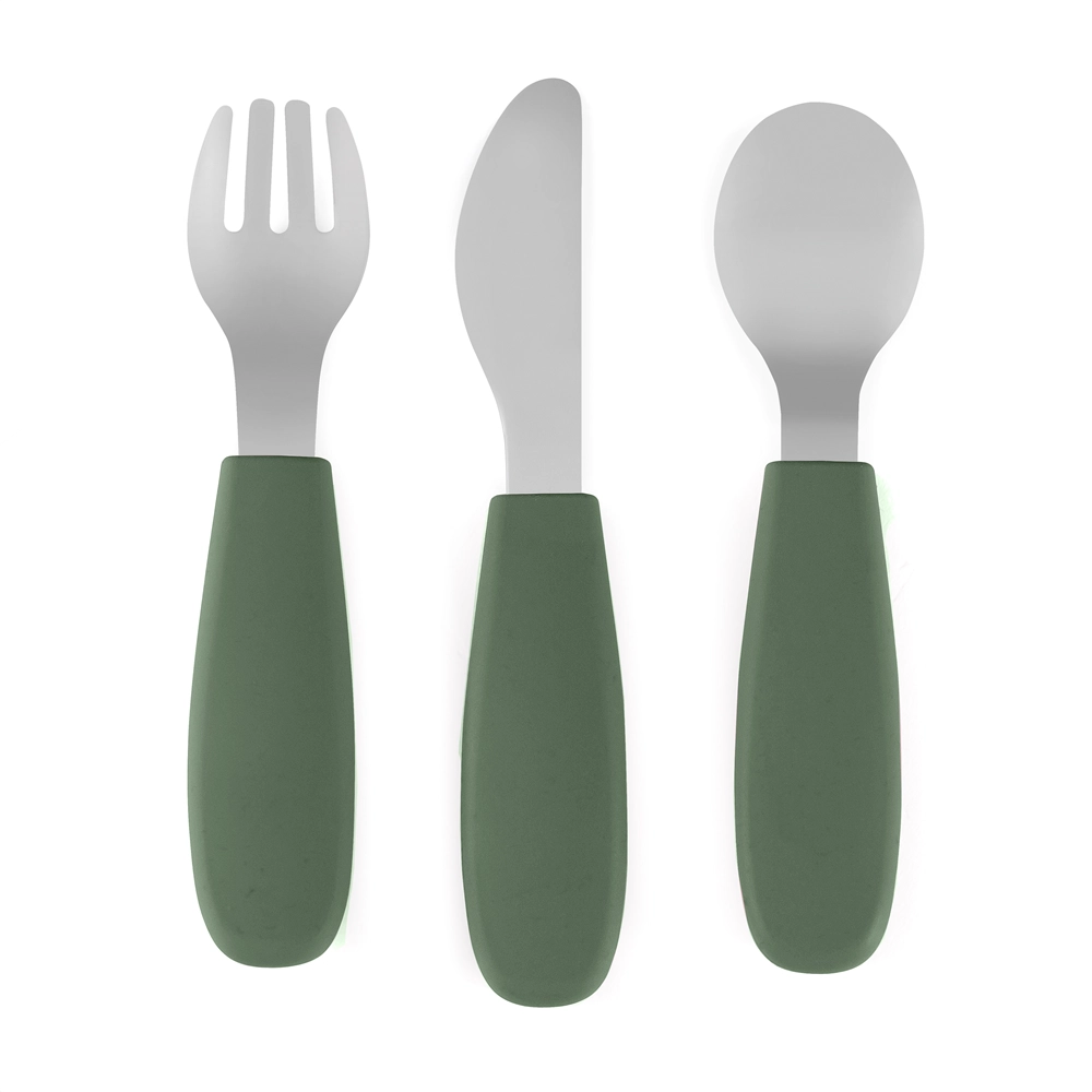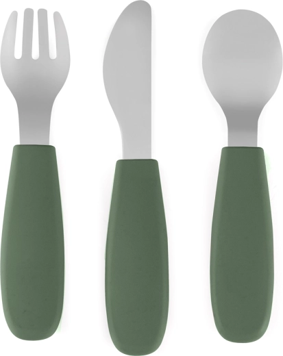 Stijlvolle set kinderbestek PETITE&MARS voor kinderen vanaf 12 maanden ondersteunt zelfstandig eten. Bevat een lepel, vork en veilig mes van roestvrij staal met ergonomische siliconen handgrepen. Antislip greep, afgeronde randen en eenvoudig te reinigen in de vaatwasser maken deze set tot een praktische keuze voor dagelijks gebruik. Past perfect bij de TAKE&MATCH-collectie in de kleur Misty Green.