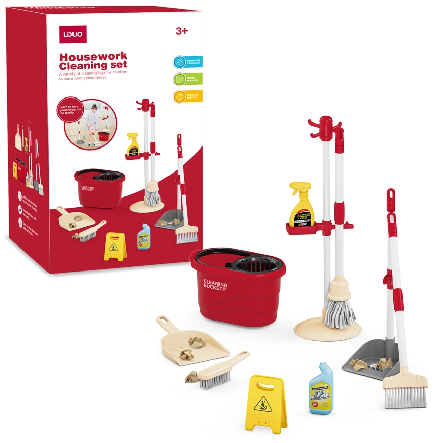De set bevat een praktische mini-mop, bezem en andere nuttige hulpmiddelen die echte gereedschappen nabootsen. Zo begrijpen kinderen hoe belangrijk het is om orde te houden, terwijl ze tegelijk coördinatie en zelfstandigheid oefenen.