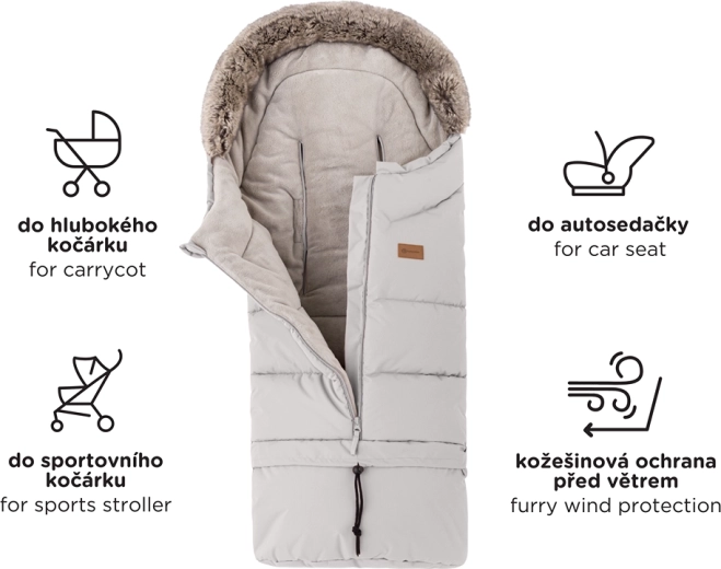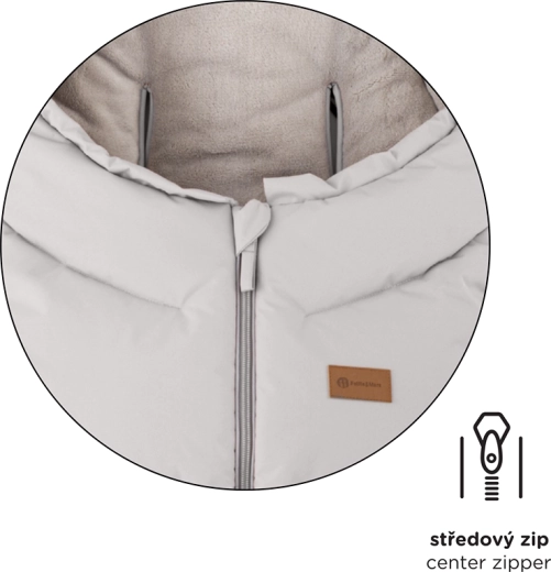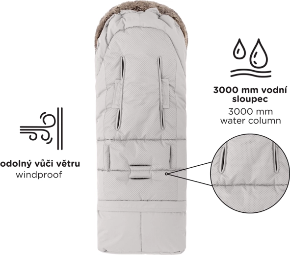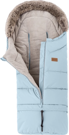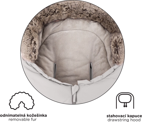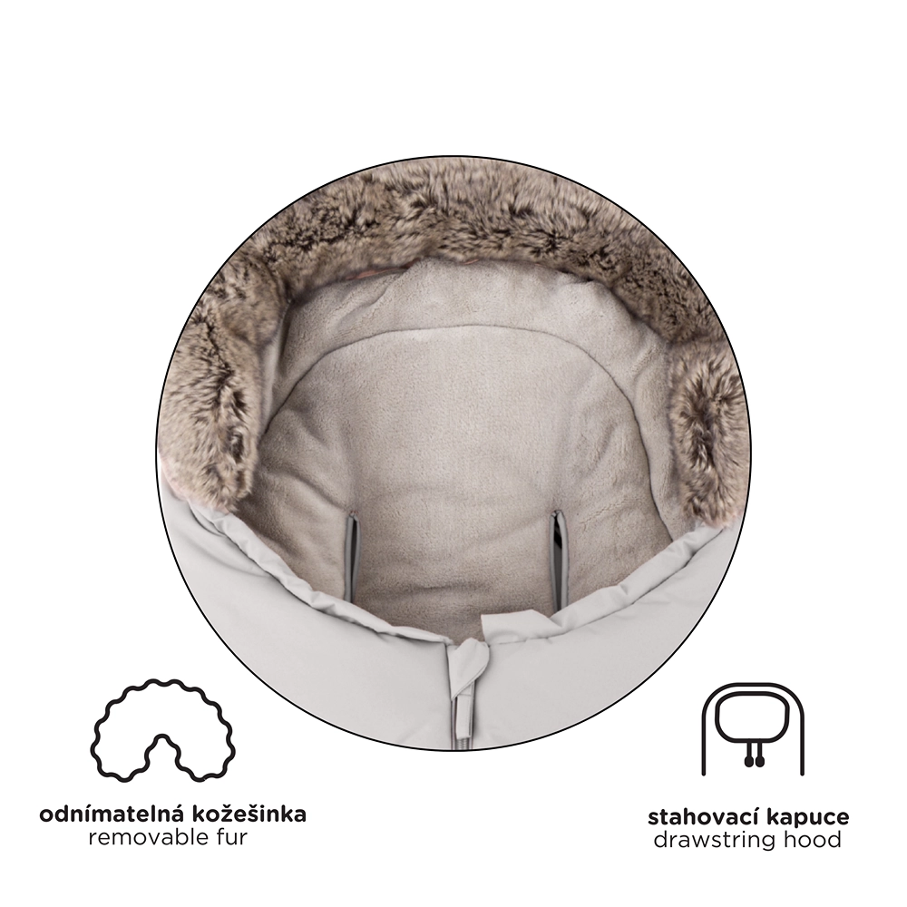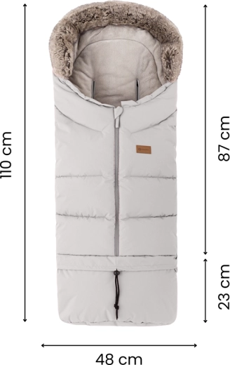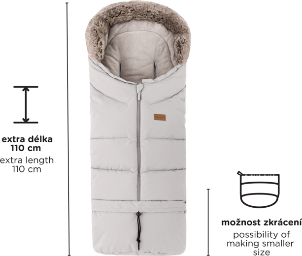 Verkort de voetenzak eenvoudig door het onderstuk los te ritsen voor de reiswieg of het autostoeltje; in de volledige lengte van 110 cm is hij ideaal voor de wandelwagen. De bontkraag dient als bescherming tegen de wind.