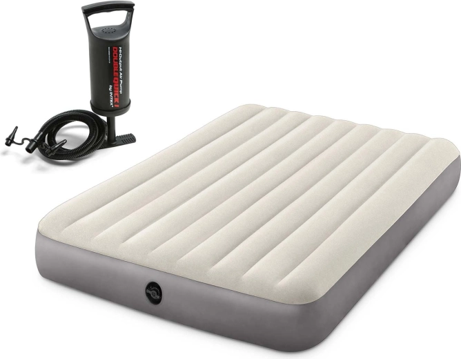 Tweepersoons opblaasbaar luchtbed van Intex met afmetingen 203 × 152 × 25 cm biedt comfortabele slaap thuis en onderweg. Dankzij de FIBER-TECH- en DURA-BEAM-technologie is de matras stabiel, duurzaam en vormvast, ook bij hogere belasting. In de verpakking zit een handmatige zuigerpomp voor snel oppompen en een plakker voor eventuele reparaties. Het geflockte oppervlak zorgt voor een prettig gevoel en antislip.