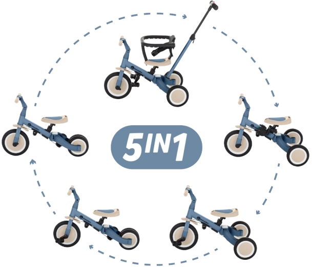 Een meegroeidriewieler voor kinderen van 1,5–5 jaar, die eenvoudig verandert van een loopwagen met ouderassistentie naar een zelfstandige fiets met pedalen. Dankzij 5 modi, verstelbaar stuur, kantelbaar zadel met riemen en slijtvaste rubberen wielen helpt hij veilig evenwicht en coördinatie te ontwikkelen. Gereedschapsloos verander je de configuratie in een oogwenk; de lichte constructie van 5,6 kg is ideaal voor thuis en buiten.