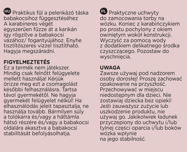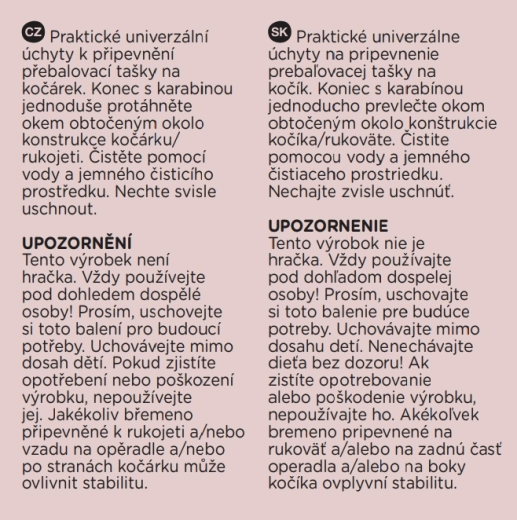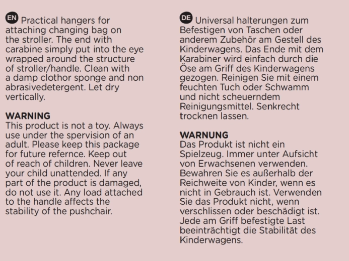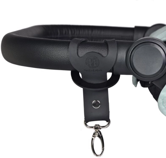 Wikkel de riem eenvoudig rond de handgreep van de kinderwagen en sluit met een drukknoop; de tas wordt bevestigd aan een robuuste draaibare karabijnhaak.