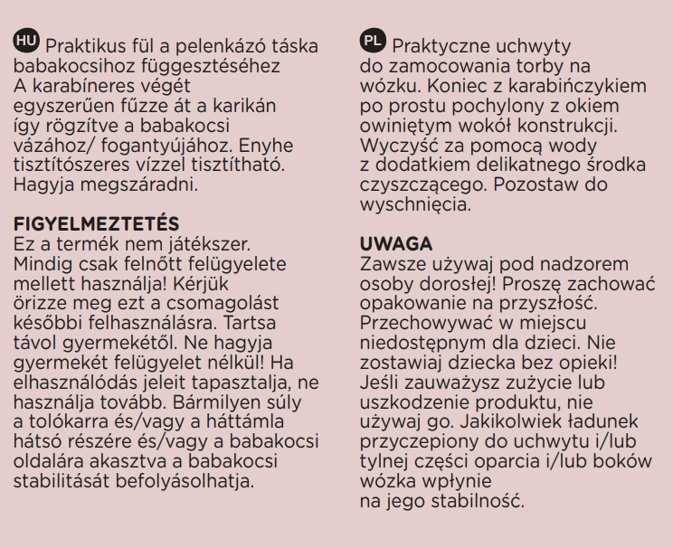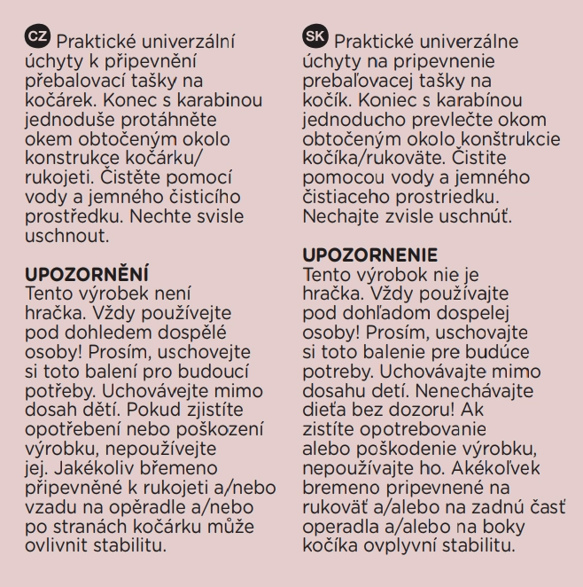 De oplossing is ideaal voor luiertassen, handtassen en kleine boodschappen. De flexibele riem wikkel je eenvoudig rond het frame, klik je vast en is klaar voor gebruik. Onderhoud is eenvoudig – water en een mild reinigingsmiddel zijn voldoende.