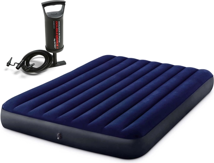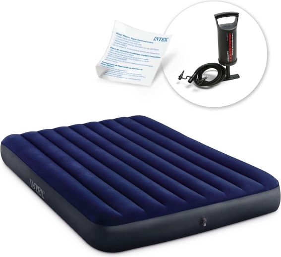 Dubbelwandig opblaasbaar luchtbed van INTEX met afmetingen 203 × 152 × 25 cm, ideaal voor gasten en kamperen. Biedt een prettig fluweelachtig (suède) oppervlak, stevige en stabiele ondersteuning dankzij FIBER-TECH en DURA-BEAM en snel opblazen met de handpomp. Inclusief reparatiepatch en AirLock-certificering voor bewezen luchtdichtheid.