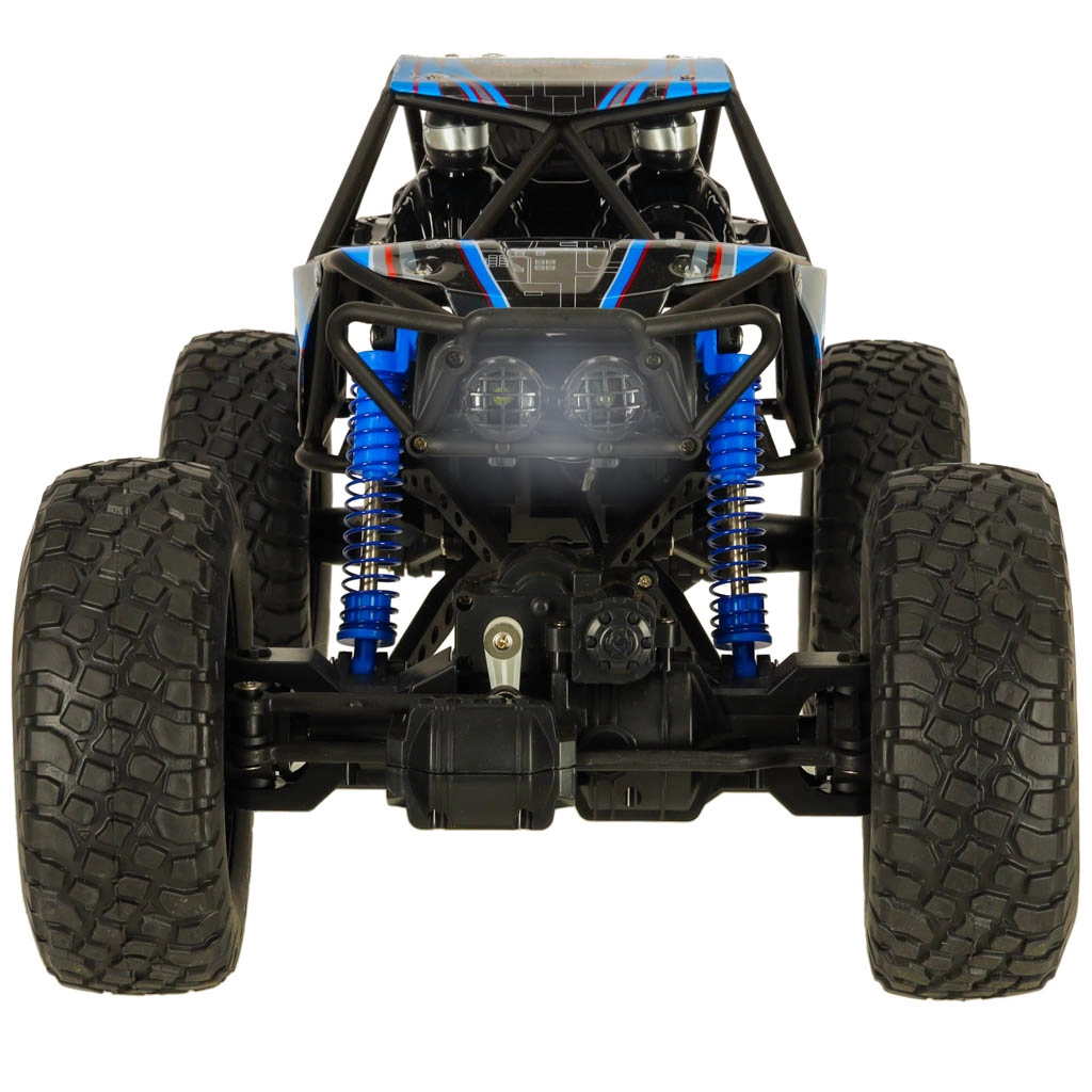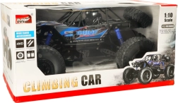 Grote op afstand bestuurbare terreinwagen op schaal 1:10 met 4×4-aandrijving, veerophanging en reusachtige rubberen banden voor zekere tractie in zwaar terrein. Betrouwbare 2,4 GHz-besturing, bereik tot 60 m en rijtijd van ongeveer 20 minuten per lading.