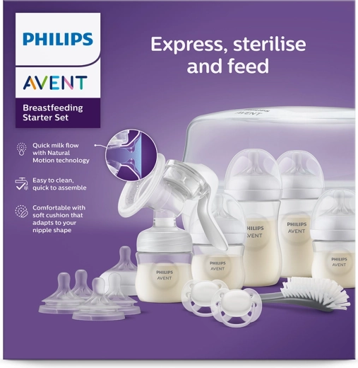 Complete oplossing voor borstvoeding: steriliseer, kolf en voed met één praktische set. Handkolf met Natural Motion‑technologie voor een natuurlijke zuigritme, een magnetron stoomsterilisator die 99,9% van de bacteriën al in 2 minuten vernietigt en Philips Avent Natural‑flessen met borstvormige speen voor een gemakkelijke overgang tussen borstvoeding en fles. In de verpakking vind je ook extra zachte Ultrasoft‑spenen en complete accessoires voor comfortabele zorg thuis en onderweg.