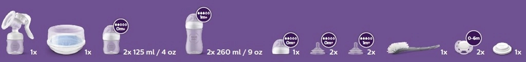 Inhoud van de verpakking: 1× handkolf voor moedermelk; 1× magnetronsterilisator; 2× Ultrasoft‑fopspeen 0–6 m; 2× speen 0 m+; 2× speen 1 m+; 2× fles 260 ml; 2× fles 125 ml; 1× flessenborstel.