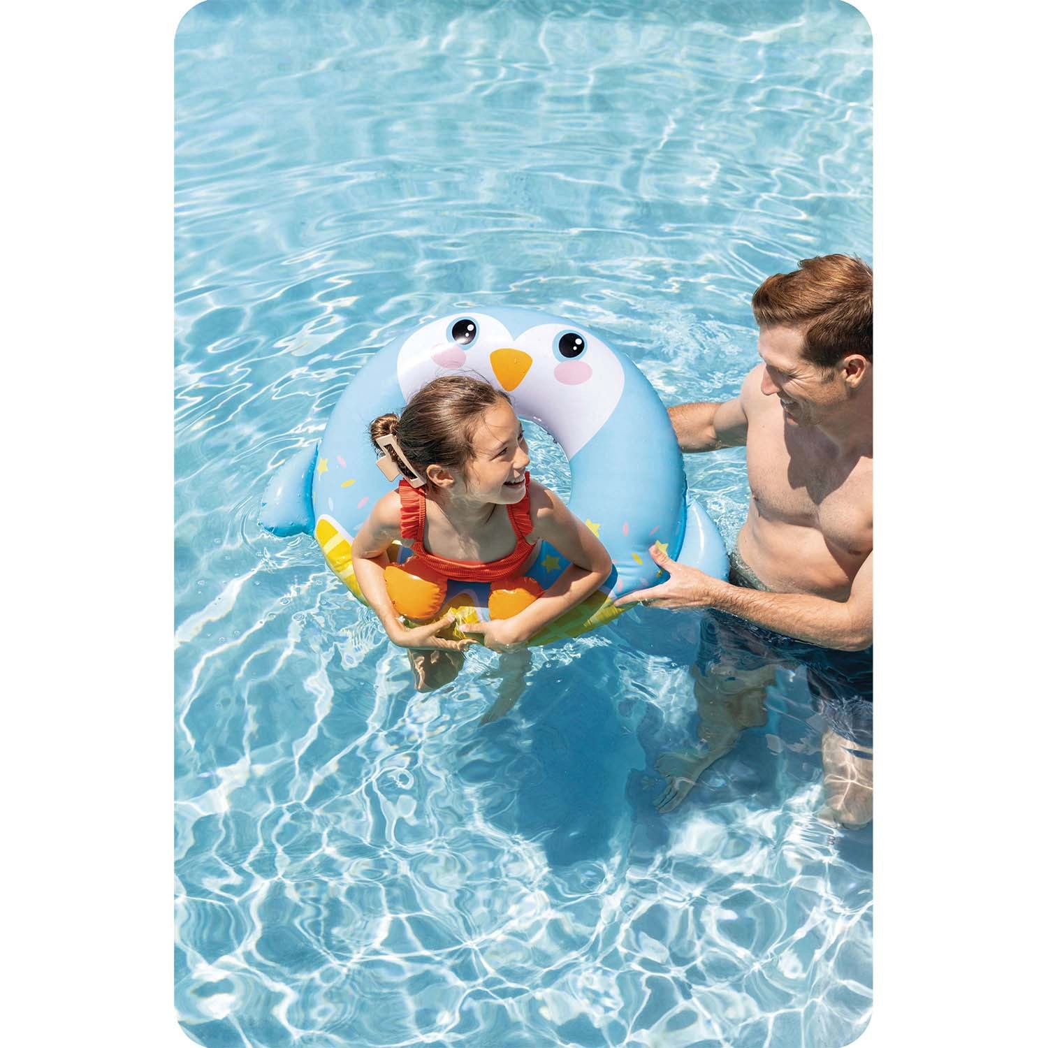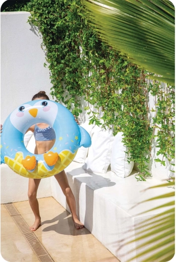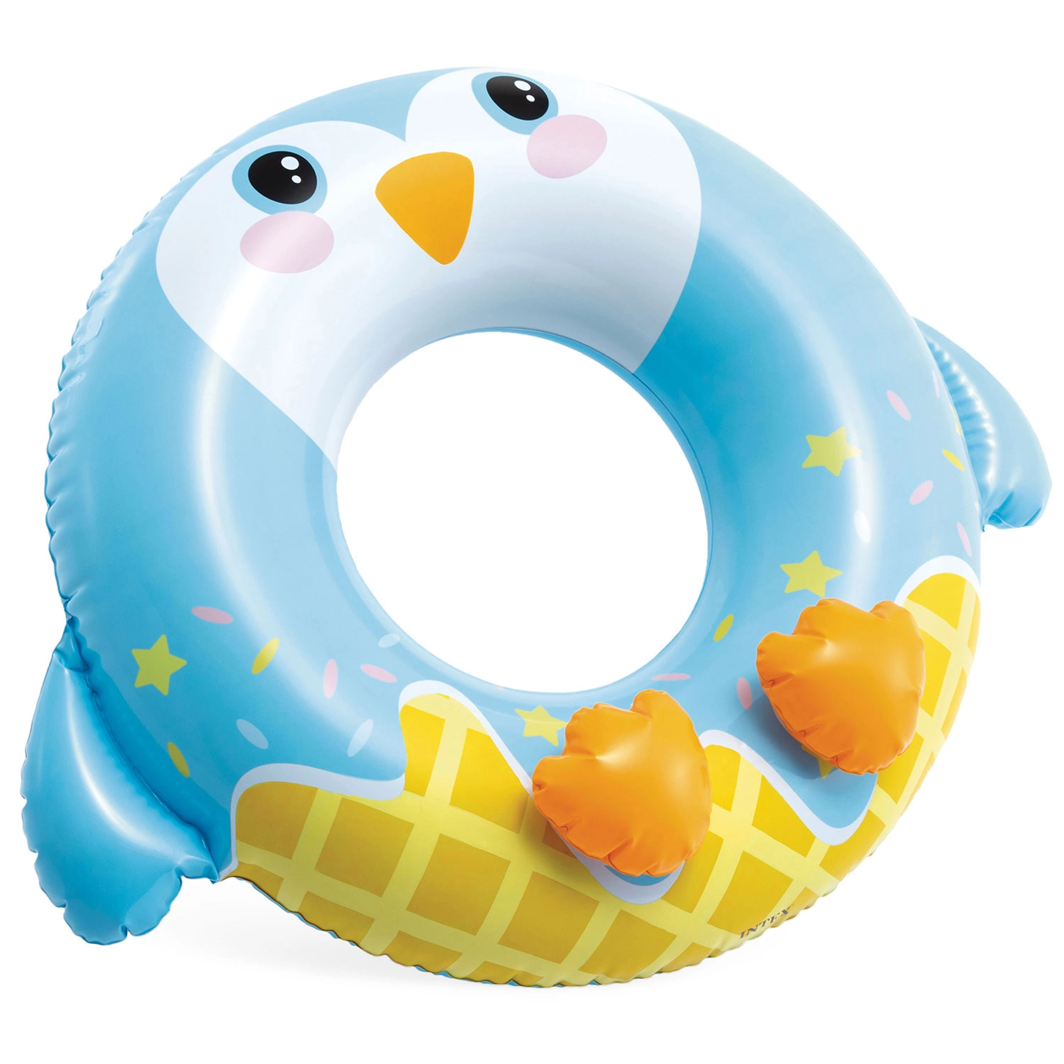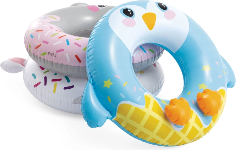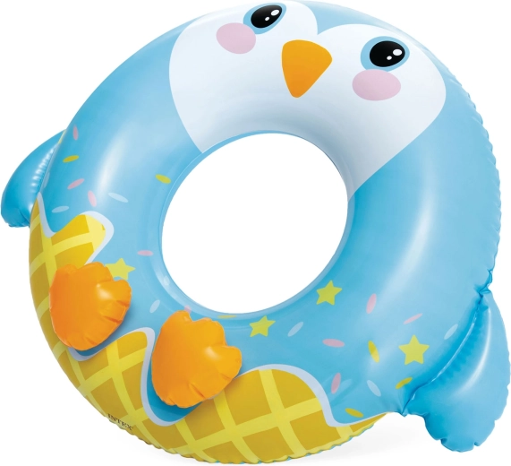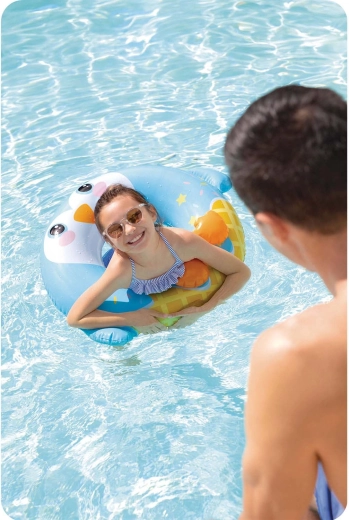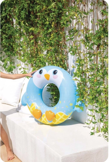 De opblaasbare zwemband van Intex met pinguïn-motief is ideaal voor zowel zwembad als strand. Dankzij de stevige PVC-folie (0,2 mm) is hij bestand tegen kleine schaafjes en klaar voor dagelijks zomers plezier. De ergonomische vorm met grote centrale opening maakt instappen en vasthouden in het water eenvoudig.
