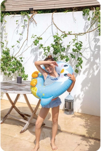 Het vrolijke design met sterretjes en pinguïn-“pootjes” zullen kinderen geweldig vinden, terwijl ouders het veilige draagvermogen tot 40 kg en de aanbevolen leeftijd vanaf 8 jaar waarderen. De band is makkelijk op te blazen en leeg te laten lopen en kan dankzij de compacte afmetingen probleemloos in de tas worden opgeborgen.