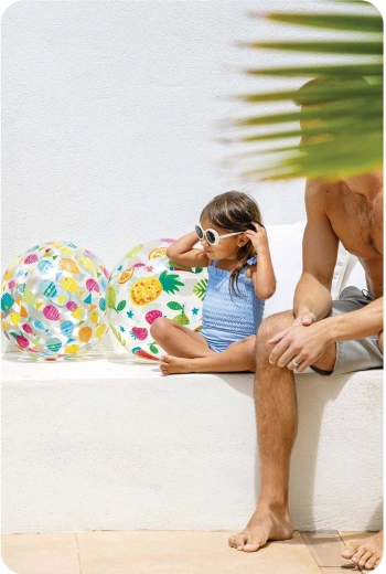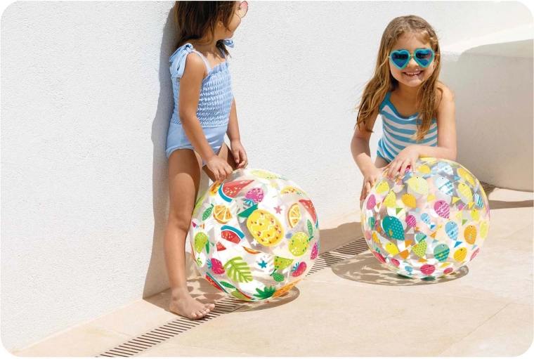 De transparante panelen met kleurrijke print spreken zowel kinderen als volwassenen aan, de bal is goed zichtbaar in het water en de lichte constructie maakt gooien, vangen en overspelen gemakkelijk. In de verpakking zit een reparatiepatch, zodat de pret kan doorgaan na klein schadegeval.