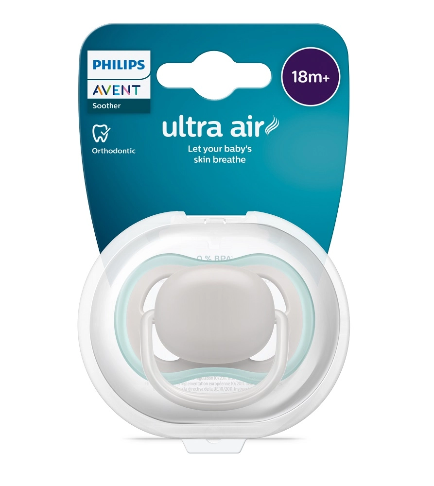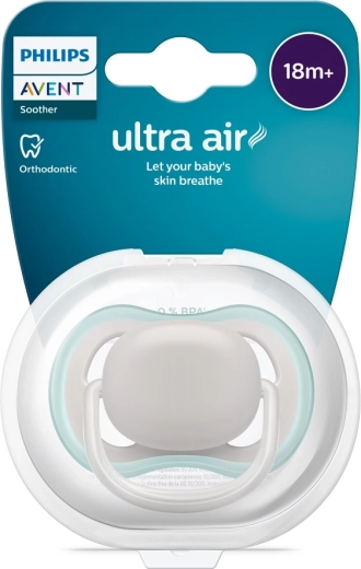Philips Avent Ultra Air is een fopspeen ontworpen voor comfort en een gezonde ontwikkeling. Grote luchtopeningen zorgen voor betere luchtcirculatie en helpen de gevoelige babyhuid droger te houden. De zachte, getextureerde en extra stevige siliconen speen respecteert de natuurlijke vorm van gehemelte, tanden en tandvlees, ideaal ook tijdens het doorkomen van tandjes.