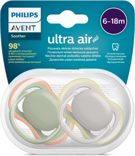 De Philips Avent Ultra Air-fopspeen is ontwikkeld in samenwerking met medische experts en moeders om maximaal comfort en veiligheid te bieden. De extra grote openingen in de schild laten de huid vrij ademen en verminderen het risico op irritatie. De orthodontische, samendrukbare en symmetrische speen ondersteunt de natuurlijke ontwikkeling van tanden en tandvlees en helpt je kleintje snel te kalmeren.