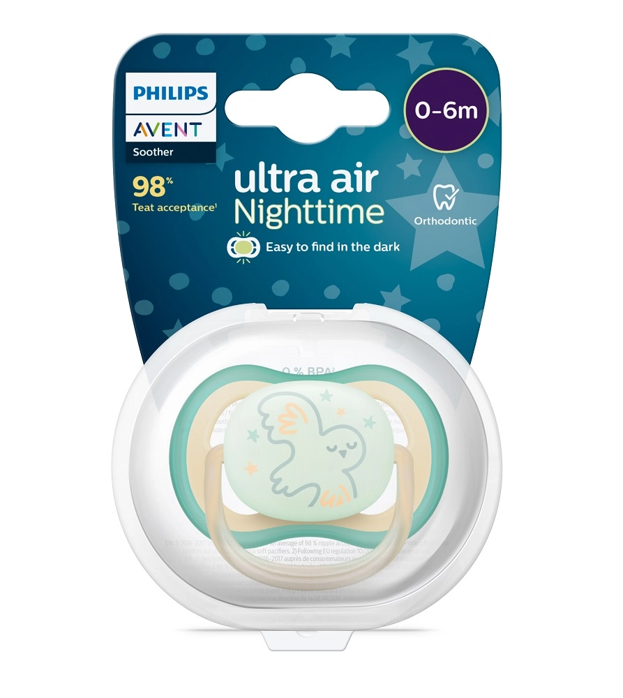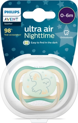 PHILIPS AVENT Ultra Air nacht is een lichte en zachte fopspeen, ontworpen voor maximaal comfort voor baby’s van 0 tot 6 maanden. Dankzij de extra grote ventilatieopeningen blijft de babyhuid droger, wat irritatie vermindert. Het lichtgevende middendeel helpt ouders de fopspeen in het donker gemakkelijk terug te vinden zonder de slaap van het kind te verstoren.