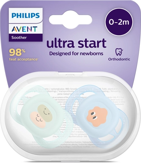 De Philips Avent Ultrastart fopspeen is speciaal ontworpen voor de allerkleinsten. De ultralichte vorm met een klein schildje respecteert de tere huid en de proporties van pasgeborenen van 0–2 maanden. De zachte siliconen speen van voedingsmiddelengeschiktheid bevordert natuurlijk zuigen en is prettig voor het tandvlees. Ventilatieopeningen in het schild verbeteren de luchtstroom en verminderen het risico op huidirritatie.