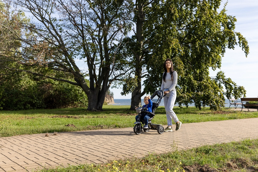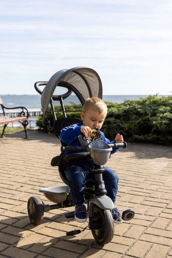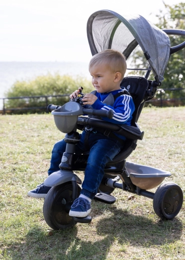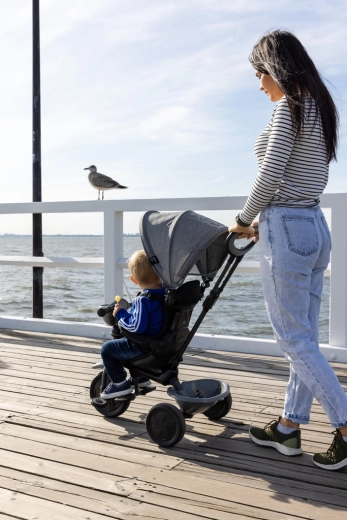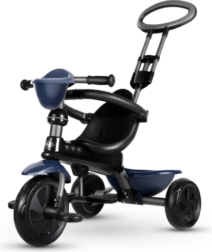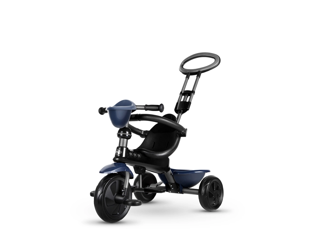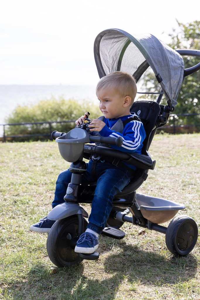 De driewieler ontwikkelt mee in 4 stappen: van volledig door de ouder bestuurde modus tot zelfstandig rijden met pedalen. Afneembare onderdelen (rugleuning, ouderduwstang, steunen/pedalen) zorgen voor de ideale afstelling in elke groeifase. Een praktische voorste fleshouder-mand en achtermand bieden ruimte voor speelgoed en spulletjes, terwijl de achterste voetparkeerrem voor veilig stilstaan zorgt.
