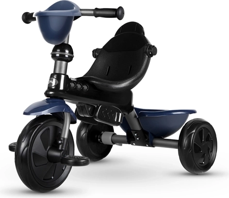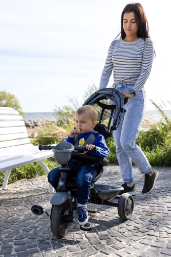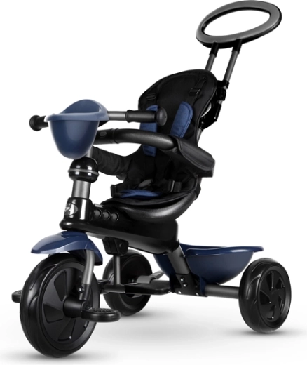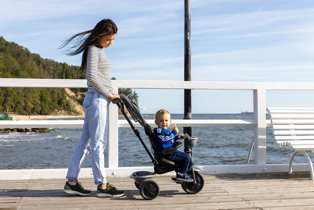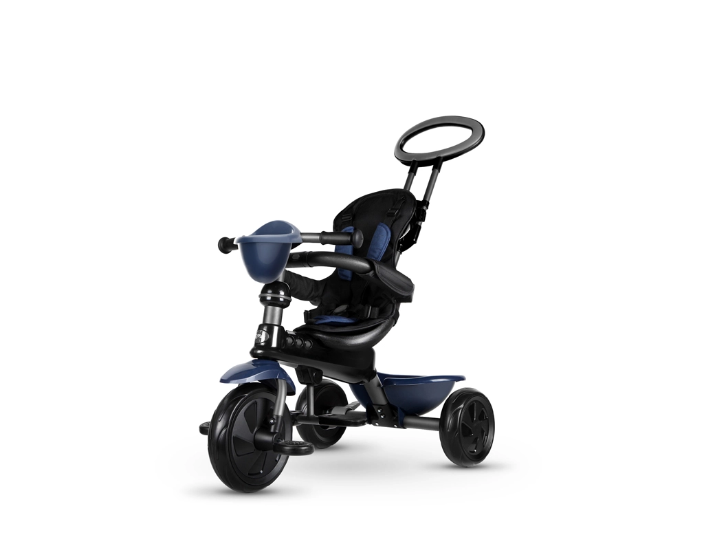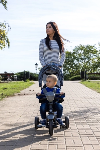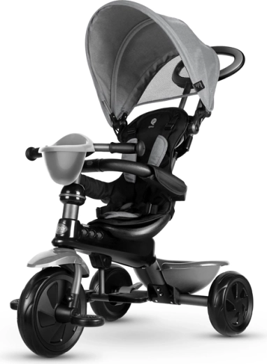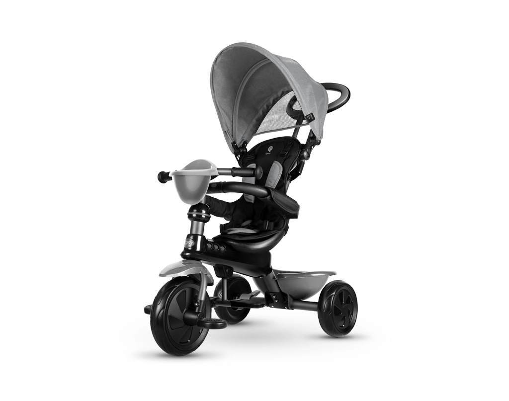 De driewieler ontwikkelt mee in 4 stappen: van volledig door de ouder bestuurde modus tot zelfstandig rijden met pedalen. Afneembare onderdelen (rugleuning, ouderduwstang, steunen/pedalen) zorgen voor de ideale afstelling in elke groeifase. Een praktische voorste fleshouder-mand en achtermand bieden ruimte voor speelgoed en spulletjes, terwijl de achterste voetparkeerrem voor veilig stilstaan zorgt.