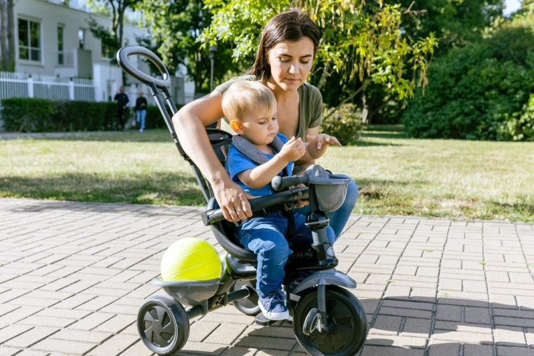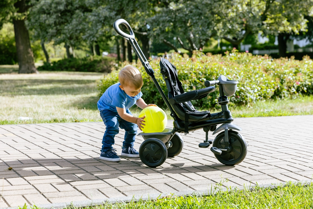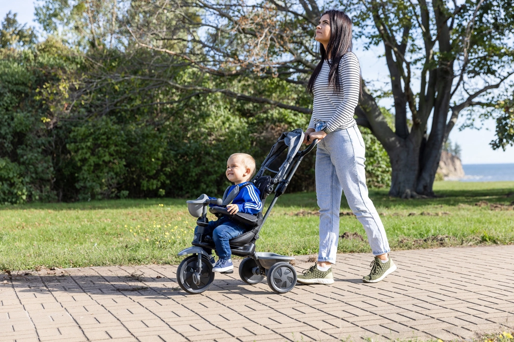 Door afneembare en verstelbare onderdelen past de driewieler zich aan de groei van je kind aan – van oudergeleide modus tot volledig zelfstandig rijden.
