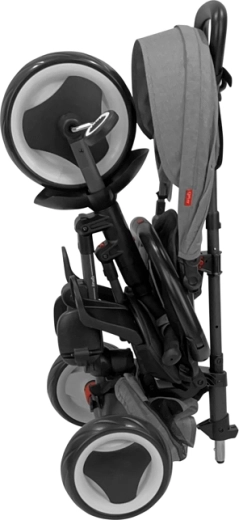 De veiligheid wordt gewaarborgd door 5‑puntsgordels, een afneembare veiligheidsbeugel en remmen op de achterwielen. Antivibratie EVA‑wielen dempen oneffenheden en zijn onderhoudsvrij. Compactheid en snelle handling zijn vanzelfsprekend: je vouwt de driewieler zonder gereedschap in 3 kliks en dankzij het slimme design verplaats je hem na het opvouwen als een reistas.