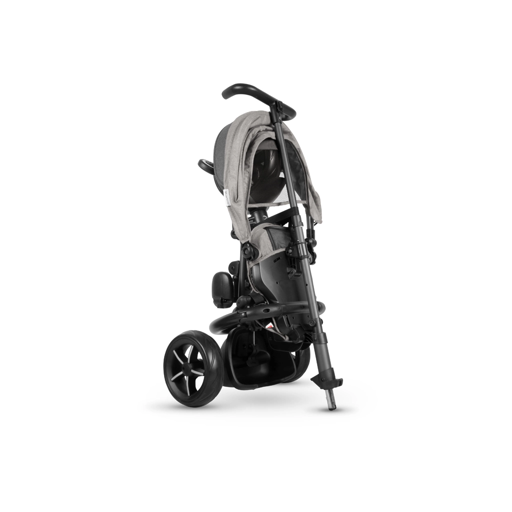 In enkele klikken ingeklapt, zonder gereedschap. Na het inklappen kan de driewieler eenvoudig worden voortgetrokken als een reistas – ideaal voor auto en ov.