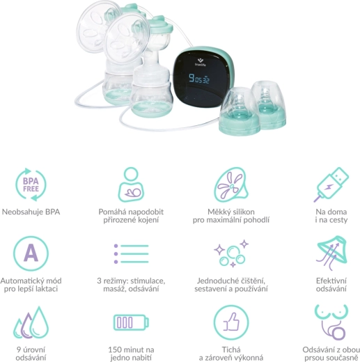 De bediening is eenvoudig dankzij het LED-display met touchknoppen en een praktische timer. Kies uit 3 modi – stimulatie, massage en kolven – en uit 9 intensiteitsniveaus voor maximaal comfort. Het lichte ontwerp, de compacte afmetingen en de batterij met een werktijd tot 150 minuten maken deze kolf ideaal voor thuis en onderweg. Zachte siliconen schildjes met een flexibele rand en BPA-vrije materialen zorgen voor veiligheid voor u en uw baby.
