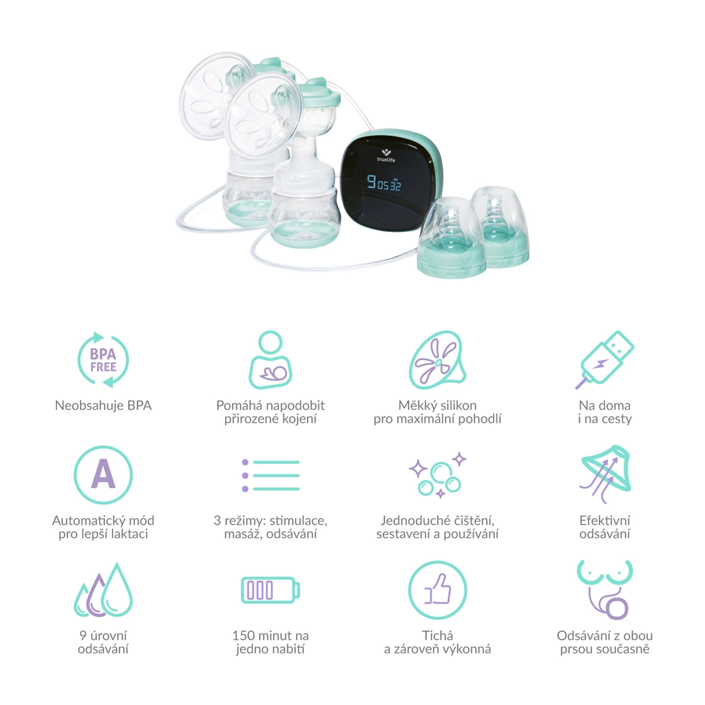 De TrueLife Nutrio BP is een betrouwbare elektrische dubbele borstkolf, ontworpen voor moeders die tijd willen besparen en maximaal comfort wensen. Gelijktijdig kolven van beide borsten ondersteunt de lactatie, bespaart tijd en maakt het mogelijk melk voor later klaar te hebben – in de koelkast blijft het tot 48 uur goed. De MilkFlowStimulation®-technologie helpt bij een milde stimulatie van de melkstroom en is ook geschikt bij borstvoedingsproblemen.