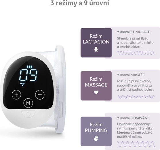 - 3 modi en 9 intensiteitsniveaus – voor milde stimulatie, ontspanning en efficiënt afkolven.