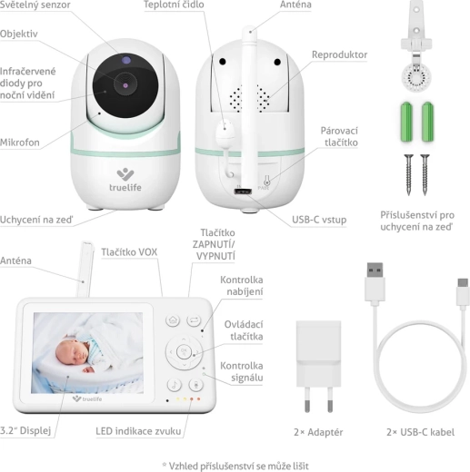 - Camera (babyunit), ouderunit, 2 × USB‑adapter, 2 × USB‑C‑kabel, accessoires voor wandmontage, handleiding en veiligheidsinstructies