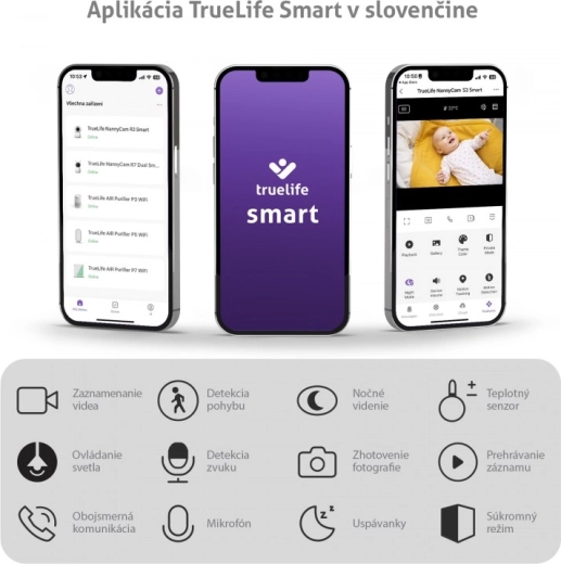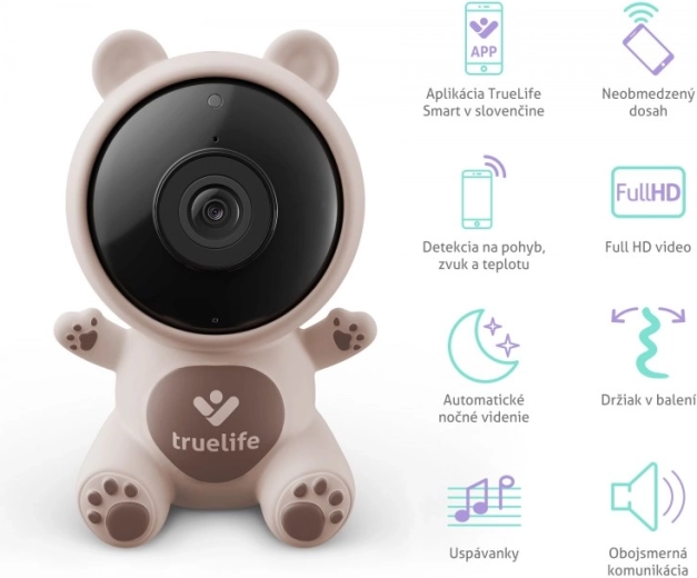 De TrueLife NannyCam S3 Smart is een elegante babyfoon met camera in berenlook die natuurlijk in de kinderkamer past. Hij biedt een kristalhelder Full HD‑beeld met een kijkhoek van 100° en automatisch nachtzicht tot 5 meter. Bij detectie van beweging, geluid of temperatuurverandering krijg je direct een melding. Dankzij de tweerichtingscommunicatie kun je je kleintje geruststellen met je eigen stem of slaapliedjes afspelen, terwijl het zachte licht van het nachtlampje voor een ontspannen sfeer zorgt.