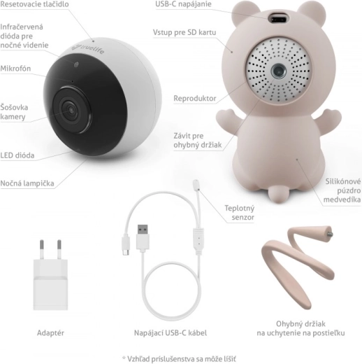 - Smartcamera NannyCam S3, siliconen berenhoes, USB‑C‑kabel met temperatuursensor, voedingsadapter, flexibele houder voor het ledikant, handleiding en veiligheidsinstructies, resetpin