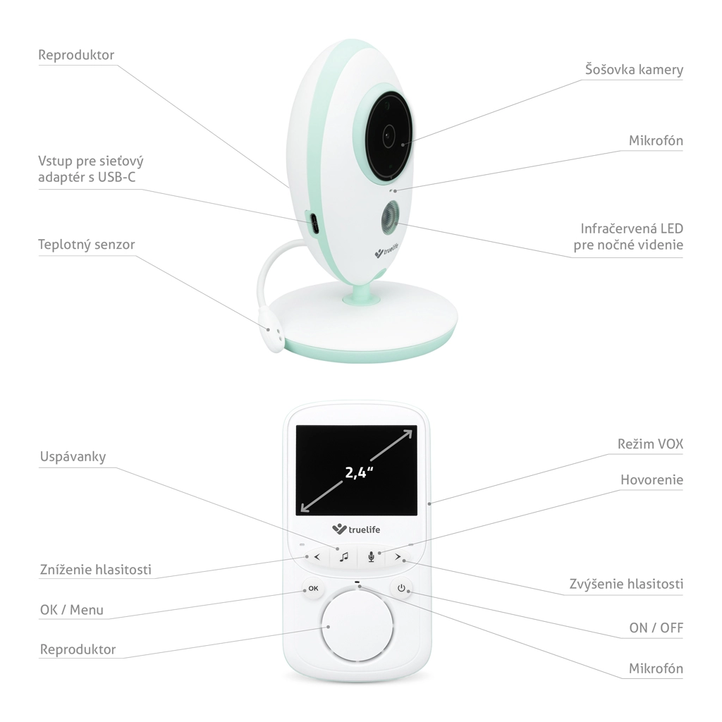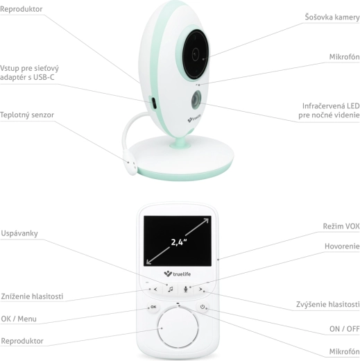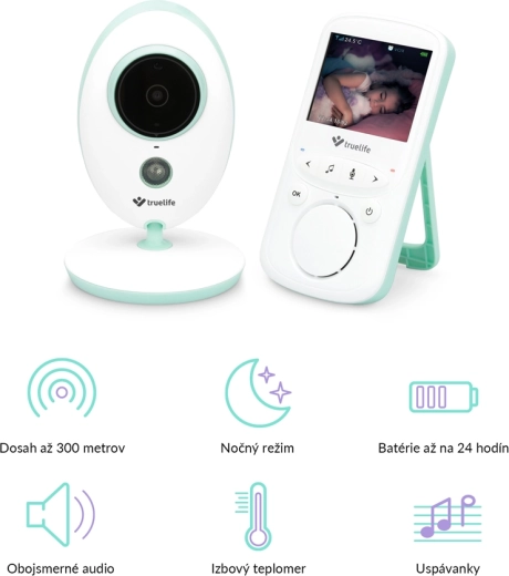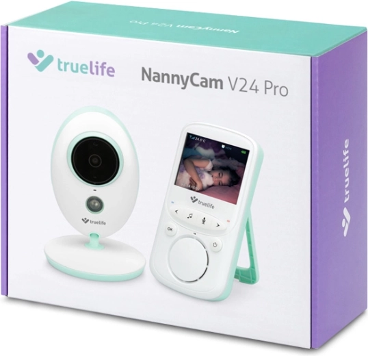 De digitale video-babyfoon TRUELIFE NannyCam V24 Pro biedt helder beeld overdag en ’s nachts, een overzichtelijk 2,4" kleurendisplay, stabiele 2,4 GHz-overdracht tot 300 m en tweerichtingscommunicatie. Dankzij de VOX-modus gaat de ouderunit op batterij tot wel 24 uur mee. Verder beschikt hij over nachtzicht, kamertemperatuurmeting, slaapliedjes en modern USB‑C opladen met powerbank-ondersteuning.