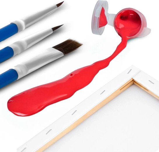 Complete set voor direct schilderplezier – voorgeprepareerd canvas op spieraam, tot 30 rijke acrylverven, 3 penselen in verschillende maten en ophanghardware.