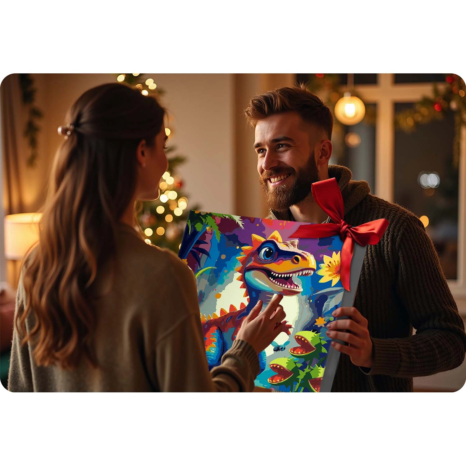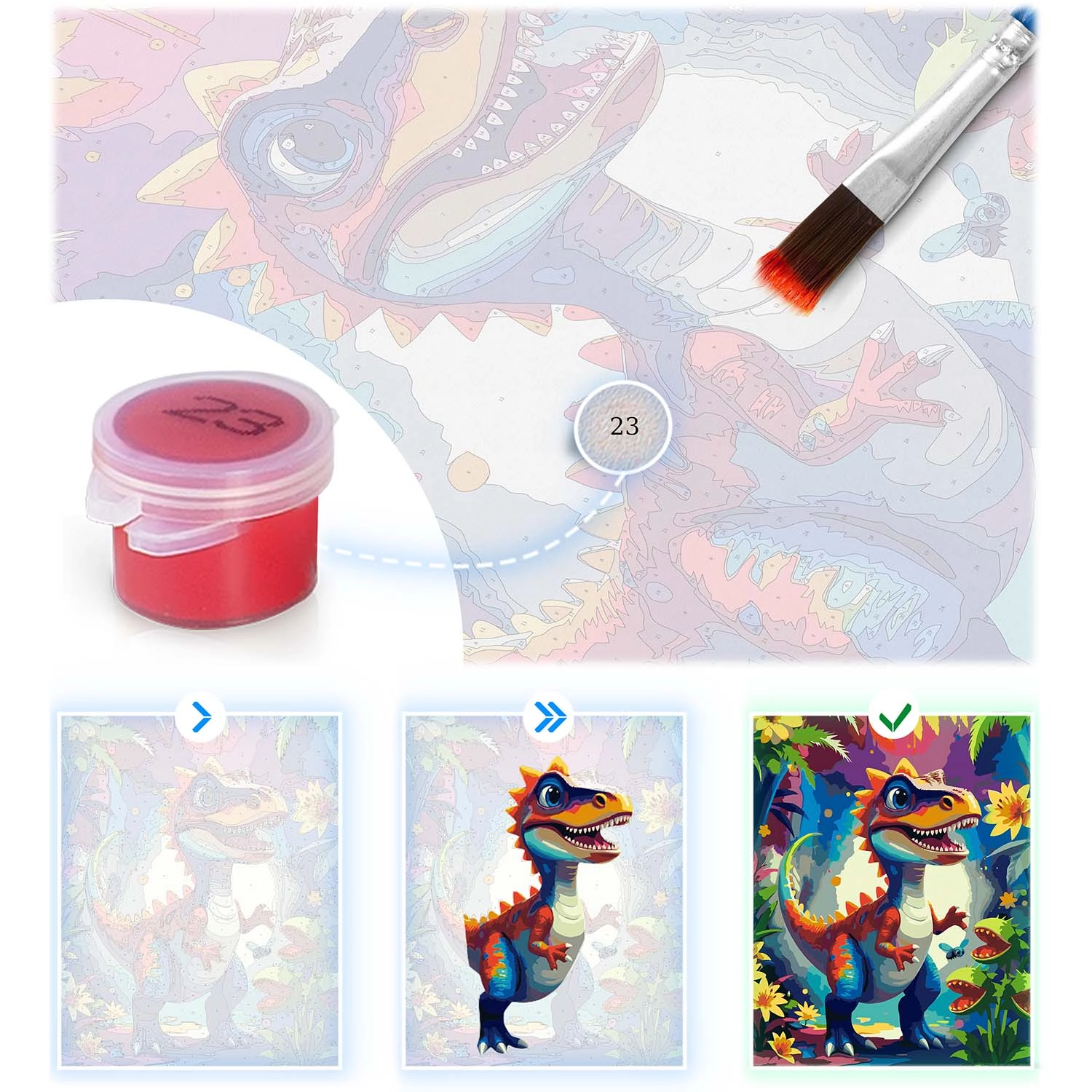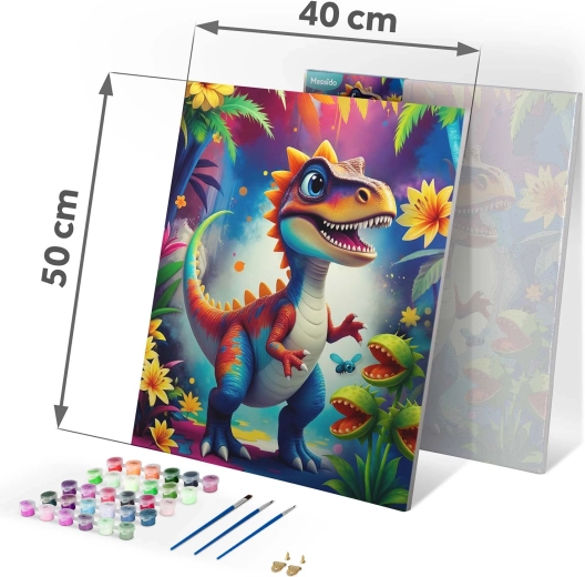 Ontdek het plezier van creëren met schilderen op nummer 40 × 50 cm met een dinosaurusmotief. De set bevat alles wat je nodig hebt: voorgeprepareerd canvas op spieraam, tot 30 dekkende acrylverven, 3 penselen in verschillende maten en haakjes om op te hangen. Dankzij de gekleurde ondergrond met fijne lijnen slagen ook beginners moeiteloos en wordt het resultaat intens van kleur en volledig dekkend zonder doorschijnende lijnen.