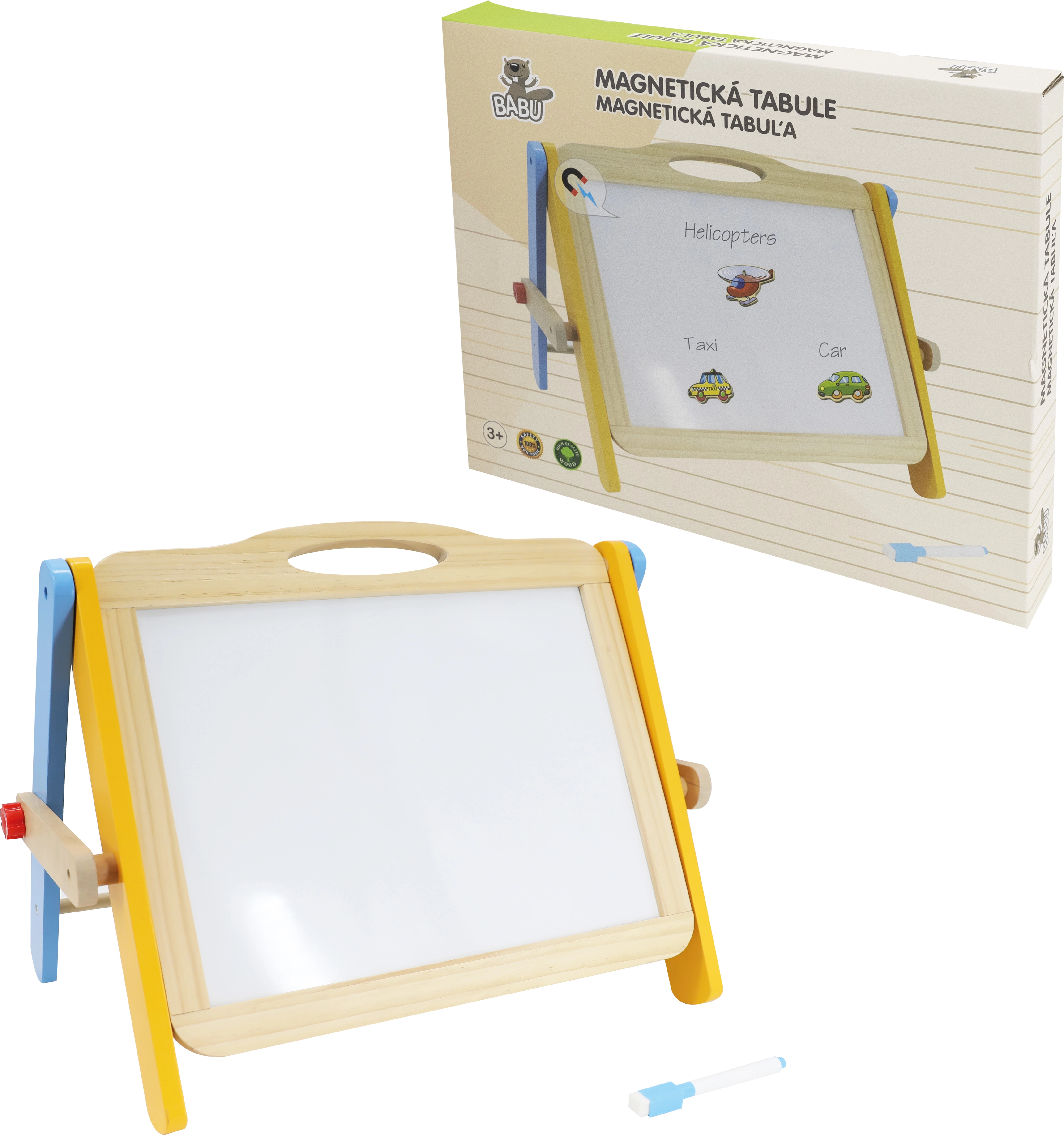 Het dubbelzijdige magnetische bord BABU biedt kinderen ruimte om te tekenen, te schrijven en om kennis te maken met letters en cijfers. De ene kant is een klassiek krijtbord, de andere kant is een magnetisch oppervlak voor het bevestigen van letters en andere magnetische stukjes. De stabiele houten constructie garandeert een lange levensduur en veilig gebruik.