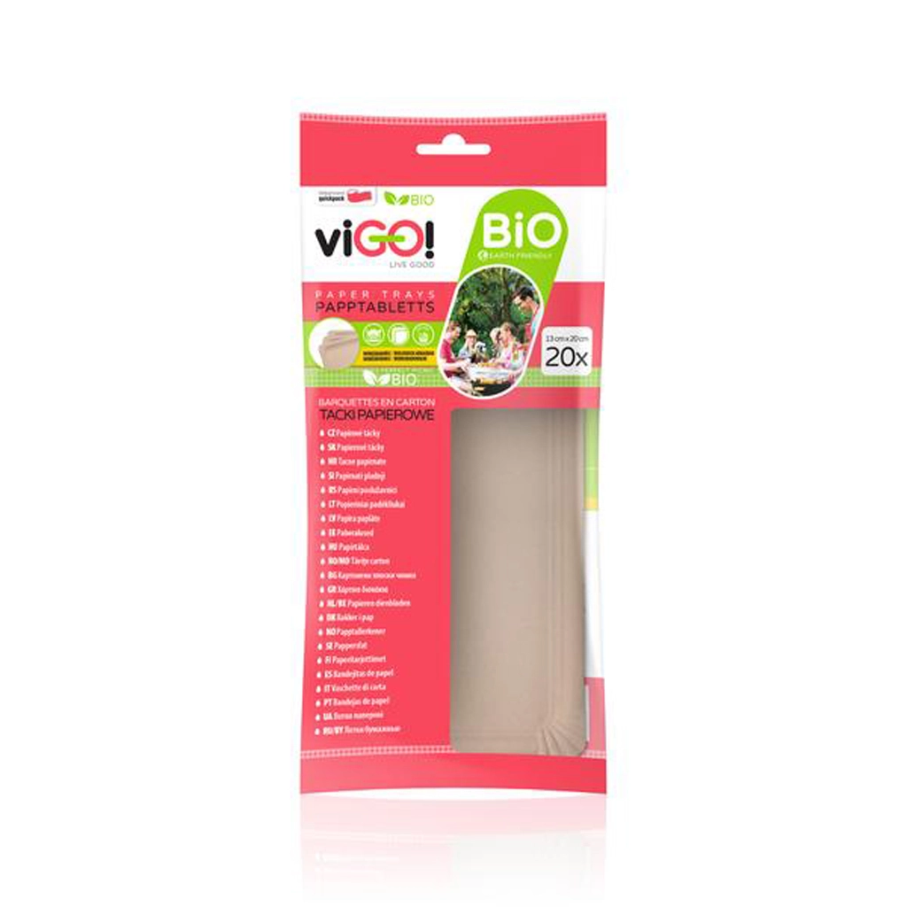 Milieuvriendelijke en praktische bio papieren schaaltjes VIGO in de kleur bruin, ideaal voor het serveren van gerechten tijdens picknicks, feestjes en food-evenementen. Dankzij het formaat van 13 × 20 cm zijn ze perfect voor desserts, hapjes en kleinere porties. De verpakking van 20 stuks biedt voldoende schaaltjes voor familie en vrienden, terwijl het natuurlijke materiaal een duurzame levensstijl ondersteunt.