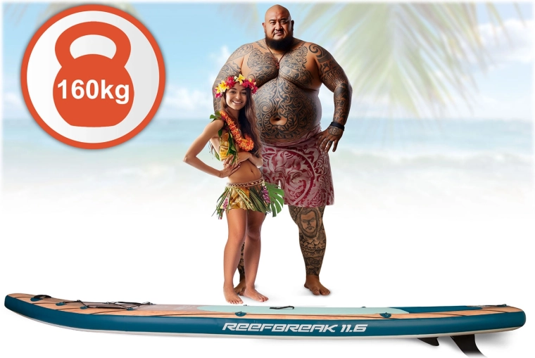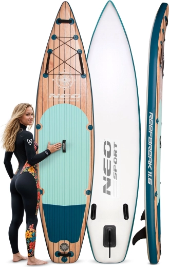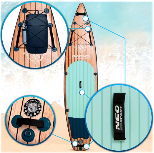 Ontdek het stabiele en duurzame opblaasbare paddleboard Reefbreak van Neo‑Sport met afmetingen 350 × 81 × 15 cm. Dankzij de Drop Stitch Light-technologie en de drie-laagse PVC-constructie biedt het uitstekende stijfheid, laag gewicht en een draagvermogen tot 160 kg. In de verpakking vind je een complete accessoireset – een verstelbare aluminium peddel, handpomp, zitje met rugleuning en opbergvak, veiligheids-leash, afneembare vin, rugzak en reparatieset. De antislip EVA-pad, 5 praktische handgrepen en het voorste bungeesysteem garanderen comfort en veiligheid op rustig water en kleine golven.