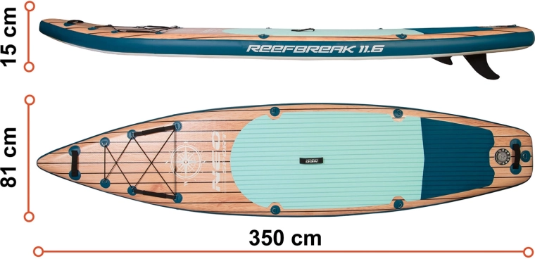 De Reefbreak 350 is een veelzijdige SUP voor recreatief peddelen, tochten en workouts op het water. Drie-laags PVC met dubbel geweven Drop Stitch, versterkte naden en een geïntegreerde carbonversterking langs de rails bieden uitzonderlijke stijfheid zonder onnodig gewicht. Dankzij de breedte van 81 cm is het board stabiel voor zowel beginners als gevorderden, terwijl het wendbaarheid en een goede koers behoudt.